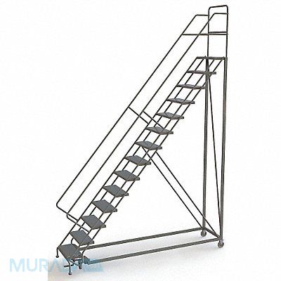Configurable Rolling Ladder Material Steel Platform Height 140 in Handrails Included Yes Handrail Height 36 in Overall Height 176 in Number of Steps 14 Unassembled Load Capacity 450 lb Step Tread Perforated Platform Depth 17 in Platform Width 24 in Bottom Width 40 in Base Depth 132 in Overall Width 40 in Climbing Angle 50 Degrees Step Depth 8 1/2 in Step Width 24 in Ladder Actuation Foot Activated Step Lock Finish Powder Coated Color Gray Standards ANSI OSHA