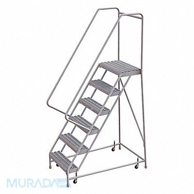 Rolling Ladder Material Aluminum Platform Height 60 in Handrails Included Yes Handrail Height 32 in Overall Height 92 in Number of Steps 6 Assembled Load Capacity 350 lb Step Tread Serrated Platform Depth 14 in Platform Width 24 in Bottom Width 32 in Base Depth 51 in Overall Width 32 in Climbing Angle 56 Degrees Step Depth 7 in Step Width 24 in Ladder Actuation Spring-Loaded Casters Finish Aluminum Mill Color Aluminum Standards ANSI OSHA Includes Crutch Tips