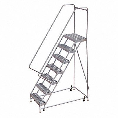 Rolling Ladder Material Aluminum Platform Height 70 in Handrails Included Yes Handrail Height 32 in Overall Height 102 in Number of Steps 7 Assembled Load Capacity 350 lb Step Tread Serrated Platform Depth 14 in Platform Width 24 in Bottom Width 32 in Base Depth 57 in Overall Width 32 in Climbing Angle 56 Degrees Step Depth 7 in Step Width 24 in Ladder Actuation Spring-Loaded Casters Finish Aluminum Mill Color Aluminum Standards ANSI OSHA Includes Crutch Tips
