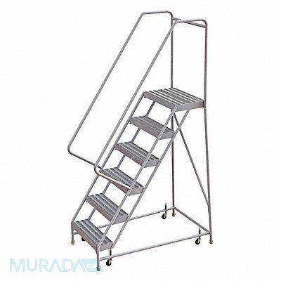 Rolling Ladder Material Aluminum Platform Height 60 in Handrails Included Yes Handrail Height 32 in Overall Height 92 in Number of Steps 6 Assembled Load Capacity 350 lb Step Tread Ribbed Platform Depth 14 in Platform Width 24 in Bottom Width 32 in Base Depth 51 in Overall Width 32 in Climbing Angle 56 Degrees Step Depth 7 in Step Width 24 in Ladder Actuation Spring-Loaded Casters Finish Aluminum Mill Color Aluminum Standards ANSI OSHA Includes Crutch Tips
