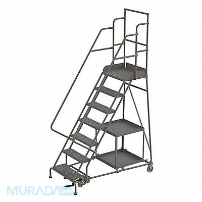 Stock Picking Rolling Ladder Material Steel Platform Height 70 in Handrails Included Yes Handrail Height 36 in Overall Height 106 in Number of Steps 7 Unassembled Load Capacity 450 lb Step Tread Perforated Platform Depth 20 in Platform Width 24 in Bottom Width 35 in Base Depth 66 in Overall Width 35 in Climbing Angle 56 Degrees Step Depth 7 in Step Width 24 in Ladder Actuation Foot Activated Step Lock Finish Powder Coated Color Gray Standards ANSI OSHA