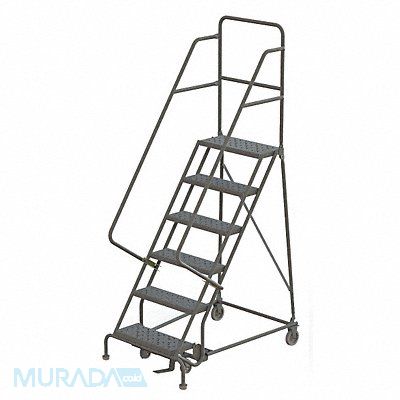 Rolling Ladder Material Steel Platform Height 70 in Handrails Included Yes Handrail Height 36 in Overall Height 106 in Number of Steps 7 Unassembled Load Capacity 450 lb Step Tread Perforated Platform Depth 10 in Platform Width 24 in Bottom Width 35 in Base Depth 57 in Overall Width 35 in Climbing Angle 56 Degrees Step Depth 7 in Step Width 24 in Ladder Actuation Foot Activated Step Lock Finish Powder Coated Color Gray Standards ANSI OSHA Includes 2-1/2 in Rubber Pads