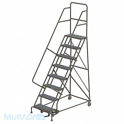 Rolling Ladder Material Steel Platform Height 80 in Handrails Included Yes Handrail Height 36 in Overall Height 116 in Number of Steps 8 Unassembled Load Capacity 450 lb Step Tread Perforated Platform Depth 10 in Platform Width 24 in Bottom Width 35 in Base Depth 64 in Overall Width 35 in Climbing Angle 56 Degrees Step Depth 7 in Step Width 24 in Ladder Actuation Foot Activated Step Lock Finish Powder Coated Color Gray Standards ANSI OSHA Includes 2-1/2 in Rubber Pads