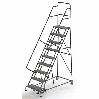 Rolling Ladder Material Steel Platform Height 90 in Handrails Included Yes Handrail Height 36 in Overall Height 126 in Number of Steps 9 Unassembled Load Capacity 450 lb Step Tread Perforated Platform Depth 10 in Platform Width 24 in Bottom Width 35 in Base Depth 69 in Overall Width 35 in Climbing Angle 56 Degrees Step Depth 7 in Step Width 24 in Ladder Actuation Foot Activated Step Lock Finish Powder Coated Color Gray Standards ANSI OSHA Includes 2-1/2 in Rubber Pads