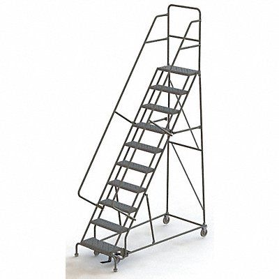 Rolling Ladder Material Steel Platform Height 100 in Handrails Included Yes Handrail Height 36 in Overall Height 136 in Number of Steps 10 Unassembled Load Capacity 450 lb Step Tread Perforated Platform Depth 10 in Platform Width 24 in Bottom Width 35 in Base Depth 76 in Overall Width 35 in Climbing Angle 56 Degrees Step Depth 7 in Step Width 24 in Ladder Actuation Foot Activated Step Lock Finish Powder Coated Color Gray Standards ANSI OSHA Includes 2-1/2 in Rubber Pads