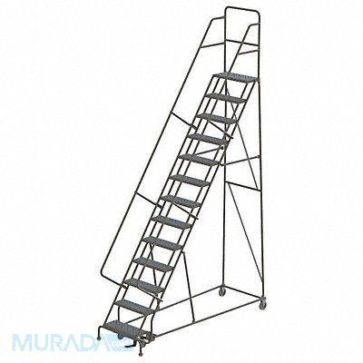 Rolling Ladder Material Steel Platform Height 130 in Handrails Included Yes Handrail Height 36 in Overall Height 166 in Number of Steps 13 Unassembled Load Capacity 450 lb Step Tread Perforated Platform Depth 10 in Platform Width 24 in Bottom Width 40 in Base Depth 96 in Overall Width 40 in Climbing Angle 56 Degrees Step Depth 7 in Step Width 24 in Ladder Actuation Foot Activated Step Lock Finish Powder Coated Color Gray Standards ANSI OSHA Includes 2-1/2 in Rubber Pads