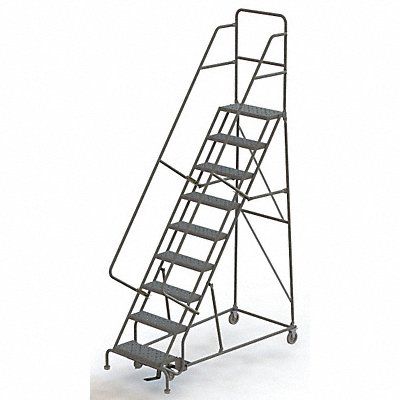 Rolling Ladder Material Steel Platform Height 90 in Handrails Included Yes Handrail Height 36 in Overall Height 126 in Number of Steps 9 Unassembled Load Capacity 450 lb Step Tread Serrated Platform Depth 10 in Platform Width 24 in Bottom Width 35 in Base Depth 69 in Overall Width 35 in Climbing Angle 56 Degrees Step Depth 7 in Step Width 24 in Ladder Actuation Foot Activated Step Lock Finish Powder Coated Color Gray Standards ANSI OSHA Includes 2-1/2 in Rubber Pads