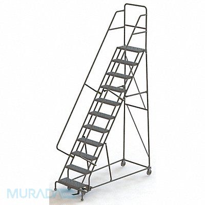 Rolling Ladder Material Steel Platform Height 110 in Handrails Included Yes Handrail Height 36 in Overall Height 146 in Number of Steps 11 Unassembled Load Capacity 450 lb Step Tread Serrated Platform Depth 10 in Platform Width 24 in Bottom Width 35 in Base Depth 83 in Overall Width 35 in Climbing Angle 56 Degrees Step Depth 7 in Step Width 24 in Ladder Actuation Foot Activated Step Lock Finish Powder Coated Color Gray Standards ANSI OSHA Includes 2-1/2 in Rubber Pads