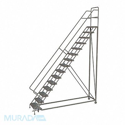 Rolling Ladder Material Steel Platform Height 150 in Handrails Included Yes Handrail Height 36 in Overall Height 186 in Number of Steps 15 Unassembled Load Capacity 450 lb Step Tread Perforated Platform Depth 17 in Platform Width 24 in Bottom Width 40 in Base Depth 141 in Overall Width 40 in Climbing Angle 50 Degrees Step Depth 8 1/2 in Step Width 24 in Ladder Actuation Foot Activated Step Lock Finish Powder Coated Color Gray Standards ANSI OSHA