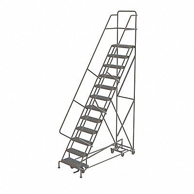 All Direction Ladder Material Steel Platform Height 120 in Handrails Included Yes Handrail Height 36 in Overall Height 156 in Number of Steps 12 Unassembled Load Capacity 450 lb Step Tread Serrated Platform Depth 10 in Platform Width 24 in Bottom Width 35 in Base Depth 90 in Overall Width 35 in Climbing Angle 56 Degrees Step Depth 7 in Step Width 24 in Ladder Actuation Foot Activated Step Lock Finish Powder Coated Color Gray Standards ANSI OSHA