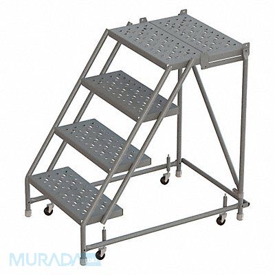 Rolling Ladder Material Steel Platform Height 40 in Handrails Included No Overall Height 40 in Number of Steps 4 Unassembled Load Capacity 450 lb Step Tread Perforated Platform Depth 30 in Platform Width 16 in Bottom Width 24 in Base Depth 55 in Overall Width 24 in Climbing Angle 56 Degrees Step Depth 7 in Step Width 16 in Ladder Actuation Spring-Loaded Casters Finish Powder Coated Color Gray Standards ANSI OSHA Includes Crutch Tips Manufacturers Warranty Length 1 yr
