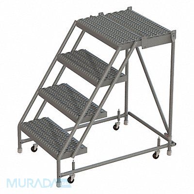 Rolling Ladder Material Steel Platform Height 40 in Handrails Included No Overall Height 40 in Number of Steps 4 Unassembled Load Capacity 450 lb Step Tread Serrated Platform Depth 30 in Platform Width 24 in Bottom Width 30 in Base Depth 55 in Overall Width 30 in Climbing Angle 56 Degrees Step Depth 7 in Step Width 24 in Ladder Actuation Spring-Loaded Casters Finish Powder Coated Color Gray Standards ANSI OSHA Includes Crutch Tips Manufacturers Warranty Length 1 yr