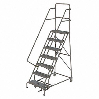 Rolling Ladder Material Steel Platform Height 70 in Handrails Included Yes Handrail Height 36 in Overall Height 106 in Number of Steps 7 Unassembled Load Capacity 450 lb Step Tread Serrated Platform Depth 10 in Platform Width 16 in Bottom Width 27 in Base Depth 57 in Overall Width 27 in Climbing Angle 56 Degrees Step Depth 7 in Step Width 16 in Ladder Actuation Foot Activated Step Lock Finish Powder Coated Color Gray Standards ANSI OSHA Includes 2-1/2 in Rubber Pads