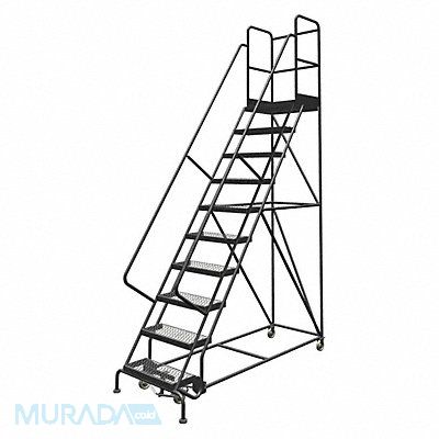 Rolling Ladder Material Steel Platform Height 100 in Handrails Included Yes Handrail Height 36 in Overall Height 136 in Number of Steps 10 Unassembled Load Capacity 450 lb Step Tread Serrated Platform Depth 30 in Platform Width 24 in Bottom Width 35 in Base Depth 96 in Overall Width 35 in Climbing Angle 56 Degrees Step Depth 7 in Step Width 24 in Ladder Actuation Foot Activated Step Lock Finish Powder Coated Color Gray Standards ANSI OSHA Includes 2-1/2 in Rubber Pads