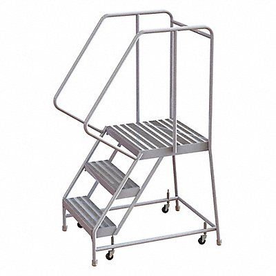 Rolling Ladder Material Aluminum Platform Height 30 in Handrails Included Yes Handrail Height 32 in Overall Height 62 in Number of Steps 3 Assembled Load Capacity 350 lb Step Tread Ribbed Platform Depth 21 in Platform Width 16 in Bottom Width 22 in Base Depth 38 in Overall Width 22 in Climbing Angle 56 Degrees Step Depth 7 in Step Width 16 in Ladder Actuation Spring-Loaded Casters Finish Aluminum Mill Color Aluminum Standards ANSI OSHA Includes Crutch Tips
