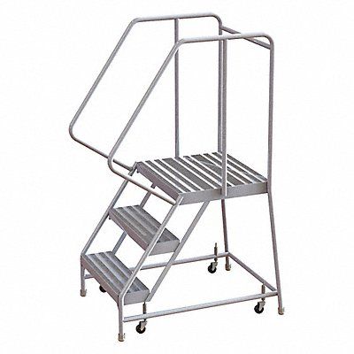 Rolling Ladder Material Aluminum Platform Height 30 in Handrails Included Yes Handrail Height 32 in Overall Height 62 in Number of Steps 3 Assembled Load Capacity 350 lb Step Tread Ribbed Platform Depth 21 in Platform Width 24 in Bottom Width 29 in Base Depth 38 in Overall Width 29 in Climbing Angle 56 Degrees Step Depth 7 in Step Width 24 in Ladder Actuation Spring-Loaded Casters Finish Aluminum Mill Color Aluminum Standards ANSI OSHA Includes Crutch Tips