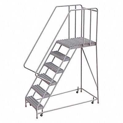 Rolling Ladder Material Aluminum Platform Height 60 in Handrails Included Yes Handrail Height 32 in Overall Height 92 in Number of Steps 6 Assembled Load Capacity 350 lb Step Tread Serrated Platform Depth 28 in Platform Width 24 in Bottom Width 32 in Base Depth 65 in Overall Width 32 in Climbing Angle 56 Degrees Step Depth 7 in Step Width 24 in Ladder Actuation Spring-Loaded Casters Finish Aluminum Mill Color Aluminum Standards ANSI OSHA Includes Crutch Tips