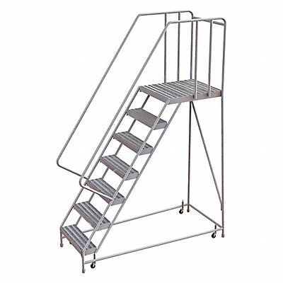 Rolling Ladder Material Aluminum Platform Height 70 in Handrails Included Yes Handrail Height 32 in Overall Height 102 in Number of Steps 7 Assembled Load Capacity 350 lb Step Tread Ribbed Platform Depth 28 in Platform Width 16 in Bottom Width 26 in Base Depth 71 in Overall Width 26 in Climbing Angle 56 Degrees Step Depth 7 in Step Width 16 in Ladder Actuation Spring-Loaded Casters Finish Aluminum Mill Color Aluminum Standards ANSI OSHA Includes Crutch Tips