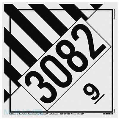 DOT Container Placard Language English Container Label/Placard Type Hazardous Class Hazard Class Class 9 (Miscellaneous Hazardous Material) DOT/UN Product Form Placard Message Miscellaneous UN3082 Label Width 10 3/4 in Label Height 10 3/4 in Material Vinyl