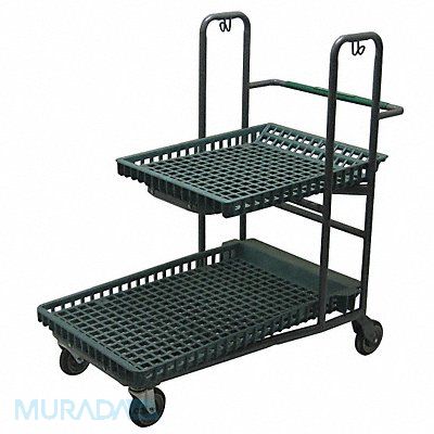 Nestable Utility Cart with Perforated Lipped Plastic Shelves Number of Shelves 2 Lip Style 4-Sided Lipped Load Capacity 600 lb Shelf Length 37 in Shelf Width 22 in Top Shelf Height 26 1/4 in Distance Between Shelves 18 in Handle Type Flat Handle Height 37 1/2 in Caster Wheel/Tread Material Rubber Caster Wheel Dia 5 in Caster/Wheel Configuration (2) Rigid (2) Swivel Cleanroom No Lip Height 1 1/4 in