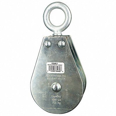 Pulley Block Designed For Wire Rope Attachment Type Swivel Eye Max Cable Size 5/16 in Rope Diameter 5/16 in Working Load Limit 1 550 lb Sheave Outside Dia 3 1/2 in Sheave Inside Dia 3/4 in Eye Hook Inside Dia None Sheave Width 11/16 in Bearing Type Plain Mounting Hole Dia 1 3/16 in Block Material 316 Stainless Steel Sheave Material Steel Length 7 5/8 in Width 3 3/4 in Finish Zinc Plated Standards ASME B30.26