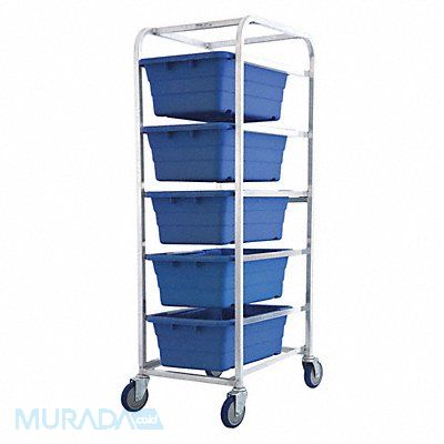 Lightweight Corrosion-Resistant Vertical Rack-Style Tub Cart Load Capacity 600 lb Includes Bins Yes Number of Bins/Tubs 5 Bin Color Blue Shelf Length 16 13/16 in Shelf Width 26 in Bin Outside Length 25 in Bin Outside Width 16 in Bin Outside Height 8 in Number of Shelves 5 Cart Color Silver Distance Between Shelves 10 in Finish Smooth Polished Frame Material Aluminum