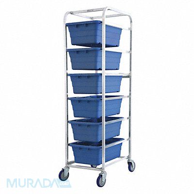 Lightweight Corrosion-Resistant Vertical Rack-Style Tub Cart Load Capacity 600 lb Includes Bins Yes Number of Bins/Tubs 6 Bin Color Blue Shelf Length 16 13/16 in Shelf Width 26 in Bin Outside Length 25 in Bin Outside Width 16 in Bin Outside Height 1 1/4 in Number of Shelves 6 Cart Color Silver Distance Between Shelves 10 in Finish Smooth Polished Frame Material Aluminum