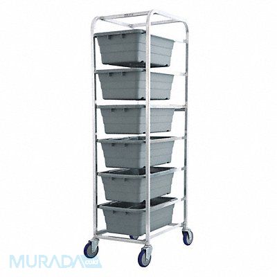 Lightweight Corrosion-Resistant Vertical Rack-Style Tub Cart Load Capacity 600 lb Includes Bins Yes Number of Bins/Tubs 6 Bin Color Gray Shelf Length 16 13/16 in Shelf Width 26 in Bin Outside Length 25 in Bin Outside Width 16 in Bin Outside Height 1 1/4 in Number of Shelves 6 Cart Color Silver Distance Between Shelves 10 in Finish Smooth Polished Frame Material Aluminum