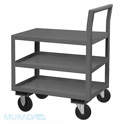 Low-Profile Utility Cart with Lipped Flush Metal Shelves Load Capacity 1 400 lb Steel Material 14 ga Gauge Powder Coated Finish Gray Color Overall Length 43 in Overall Width 25 1/2 in Number of Shelves 3 Capacity per Shelf 466 lb Distance Between Shelves 7 5/8 in Shelf Length 36 in Shelf Width 24 in Includes Raised Offset Handle Distance Between Middle and Bottom Shelf 7 5/8 in Distance Between Top and Middle Shelf 7 5/8 in Handle Height 39 5/8 in Top Shelf Height 27 5/8 in