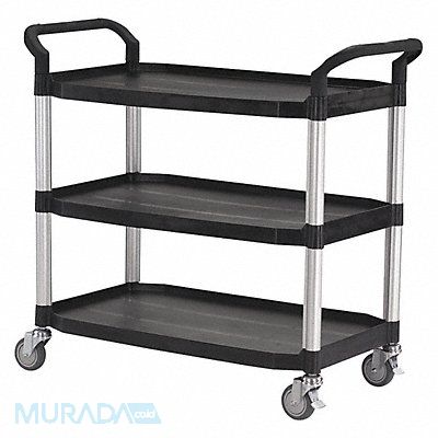 Utility Cart with Deep Lipped Plastic Shelves Number of Shelves 3 Lip Style 4-Sided Lipped Load Capacity 400 lb Shelf Length 36 1/4 in Shelf Width 20 1/4 in Top Shelf Height 34 5/8 in Distance Between Shelves 10 7/8 in Distance Between Top and Middle Shelf 10 7/8 in Distance Between Middle and Bottom Shelf 10 7/8 in Handle Type (2) Raised Handle Height 39 3/4 in Caster Brake Type Face Contact Brake Caster Wheel/Tread Material Thermoplastic Rubber Caster Wheel Dia 4 in