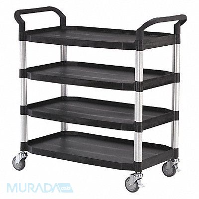 Dual-Handle Utility Cart with Lipped Plastic Shelves Number of Shelves 4 Lip Style 4-Sided Lipped Load Capacity 400 lb Shelf Length 36 1/4 in Shelf Width 20 1/4 in Top Shelf Height 37 1/8 in Distance Between Shelves 7 1/4 in Distance Between Top and Middle Shelf 7 1/4 in Distance Between Middle and Bottom Shelf 7 1/4 in Handle Type (2) Raised Handle Height 42 1/4 in Caster Brake Type Face Contact Brake Caster Wheel/Tread Material Thermoplastic Rubber Caster Wheel Dia 4 in