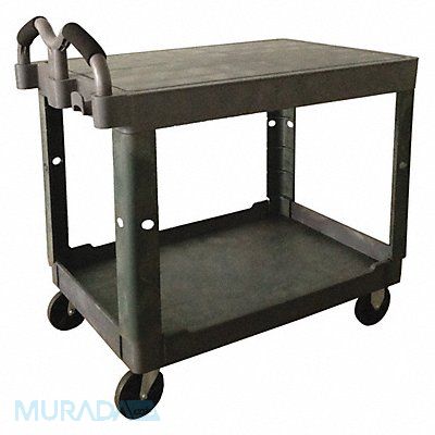 Utility Cart with Deep Lipped Flush Plastic Shelves Number of Shelves 2 Lip Style Combination Load Capacity 500 lb Shelf Length 38 1/8 in Shelf Width 24 3/8 in Top Shelf Height 32 in Distance Between Shelves 20 in Handle Type Ergonomic Handle Height 5 35/64 in Caster Wheel/Tread Material Polypropylene Caster Wheel Dia 5 in Lip Height 2 23/64 in