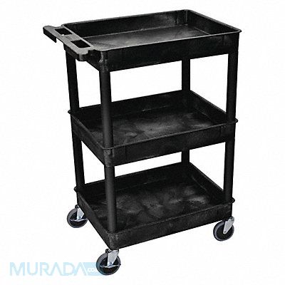 Utility Cart with Deep Lipped Plastic Shelves Number of Shelves 3 Lip Style 4-Sided Lipped Load Capacity 300 lb Shelf Length 24 in Shelf Width 18 in Top Shelf Height 38 1/2 in Distance Between Shelves 12 in Distance Between Top and Middle Shelf 12 in Distance Between Middle and Bottom Shelf 12 in Handle Type Flat Handle Height 38 in Caster Brake Type Side Pedal Brake Caster Wheel/Tread Material Thermoplastic Rubber Caster Wheel Dia 4 in