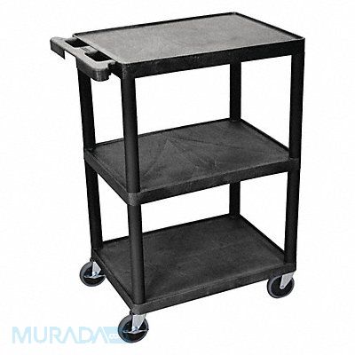Utility Cart with Lipped Plastic Shelves Number of Shelves 3 Lip Style 4-Sided Lipped Load Capacity 300 lb Shelf Length 24 in Shelf Width 18 in Top Shelf Height 32 in Distance Between Shelves 11 3/4 in Distance Between Top and Middle Shelf 11 3/4 in Distance Between Middle and Bottom Shelf 11 3/4 in Handle Type Flat Handle Height 32 in Caster Brake Type Side Pedal Brake Caster Wheel/Tread Material Thermoplastic Rubber Caster Wheel Dia 4 in