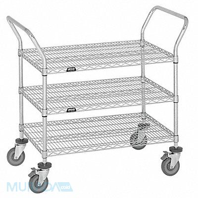 Utility Cart with Wire Shelves Load Capacity 400 lb Number of Shelves 3 Shelf Width 24 in Shelf Length 48 in Material Steel Finish Zinc Plated Caster Wheel Dia 5 in Color Silver Caster Wheel/Tread Material Polyurethane Caster/Wheel Configuration (4) Swivel Handle Type (2) Raised Lip Style Not Applicable Shelf Orientation Flat Collapsible No Overall Height 40 in Overall Length 48 in Overall Width 24 in