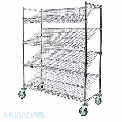 Utility Cart with Angled Lipped Wire Shelves Load Capacity 300 lb Number of Shelves 4 Shelf Width 18 in Shelf Length 60 in Material Steel Finish Zinc Plated Caster Wheel Dia 5 in Color Silver Caster Brake Type Side Pedal Brake Caster Wheel/Tread Material Plastic Caster/Wheel Configuration (2) Swivel (2) Swivel with Brake Handle Type No Handle Lip Style Combination Shelf Orientation Slanted Collapsible Yes Overall Height 68 in Overall Length 60 in Overall Width 18 1/2 in