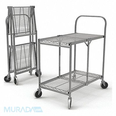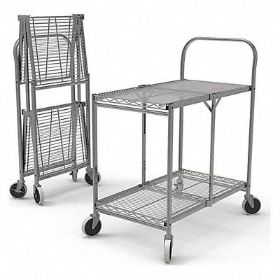 Fold-Away Utility Cart with Shallow Lipped Wire Shelves Load Capacity 200 lb Number of Shelves 2 Shelf Width 29 1/2 in Shelf Length 15 3/4 in Material Steel Finish Chrome Caster Wheel Dia 4 in Color Silver Caster Brake Type Total Lock Brake Caster Wheel/Tread Material Thermoplastic Rubber Caster/Wheel Configuration (2) Swivel (2) Swivel with Brake Distance Between Shelves 20 3/4 in Handle Type Raised Lip Style Flush Shelf Orientation Flat Collapsible Yes