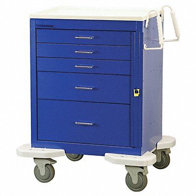 General Medical Supply Cart with Drawers Assembled/Unassembled Assembled Material Steel Load Capacity 165 lb Caster Wheel Dia 5 in Caster Wheel/Tread Material Polyurethane Caster/Wheel Configuration (2) Swivel (2) Swivel with Brake Caster Brake Type Total Lock Brake Cabinet Color Blue Drawer Color Dark Blue Number of Drawers 5 Number of Shelves 1