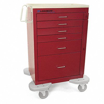 General Medical Supply Cart with Drawers Assembled/Unassembled Assembled Material Steel Load Capacity 200 lb Caster Wheel Dia 5 in Caster Wheel/Tread Material Polyurethane Caster/Wheel Configuration (2) Swivel (2) Swivel with Brake Caster Brake Type Total Lock Brake Cabinet Color Red Drawer Color Red Number of Drawers 6 Number of Shelves 1