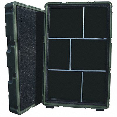 Protective Case Bottom Depth 12 3/4 in Closure Type Press and Pull Color Green Electrostatic Discharge No Includes Foam Insert No Inside Depth 18 in Inside Length 39 7/8 in Inside Width 24 1/4 in Lid Depth 5 1/4 in Material Plastic Maximum Operating Temperature 140 Degrees F Number of Latches 6 Number of Wheels 2 Overall Depth 20 1/4 in Overall Length 42 7/8 in Overall Width 27 1/4 in IP/NEMA Rating IP67 Standards DEF STAN 81-41 Weight 76 lb Caster Type Rigid