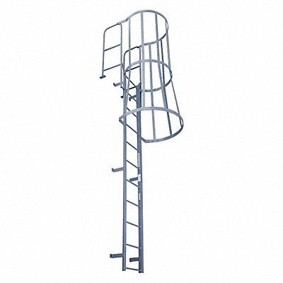 Fixed Ladder with Safety Cage Walk-Thru Included Yes Exit Forward Overall Height 13 ft 8 in Overall Width 39 in Material Steel Load Capacity 300 lb Number of Steps 11 Top Step Height 10 ft Rung Dia 3/4 in Rung/Step Spacing 12 in Step Width 16 in Finish Gray Powder Coated Standards OSHA and ANSI