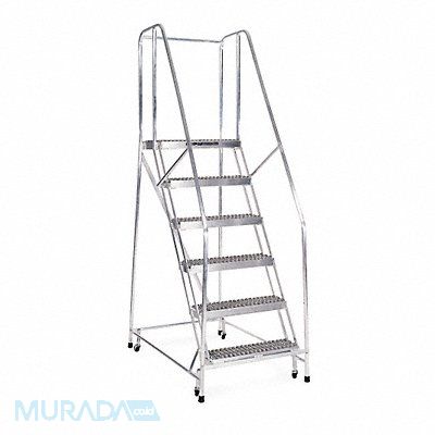 Rolling Ladder Material Aluminum Platform Height 70 in Handrails Included Yes Handrail Height 30 in Overall Height 100 in Number of Steps 7 Assembled Load Capacity 350 lb Step Tread Serrated Platform Depth 14 in Platform Width 24 in Bottom Width 30 in Base Depth 57 in Overall Width 30 in Climbing Angle 59 Degrees Step Depth 7 in Step Width 24 in Ladder Actuation Weight Activated Step Lock Finish Aluminum Acid Brightened Color Natural Standards ANSI OSHA