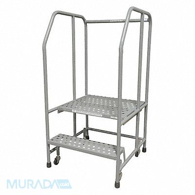 Rolling Ladder Material Steel Platform Height 20 in Handrails Included Yes Handrail Height 30 in Overall Height 50 in Number of Steps 2 Assembled Load Capacity 450 lb Step Tread Perforated Platform Depth 20 in Platform Width 24 in Bottom Width 26 in Base Depth 28 in Overall Width 26 in Climbing Angle 59 Degrees Step Depth 7 in Step Width 24 in Ladder Actuation Weight Activated Step Lock Finish Powder Coated Color Gray Standards ANSI OSHA Rear Exit No