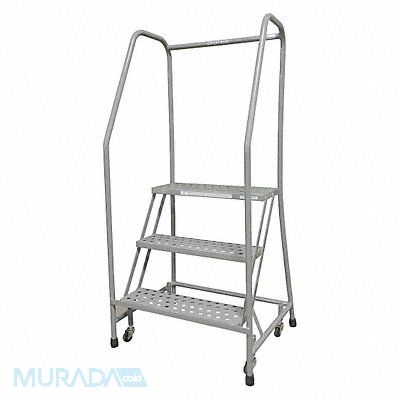 Rolling Ladder Material Steel Platform Height 30 in Handrails Included Yes Handrail Height 30 in Overall Height 60 in Number of Steps 3 Assembled Load Capacity 450 lb Step Tread Perforated Platform Depth 10 in Platform Width 24 in Bottom Width 30 in Base Depth 26 in Overall Width 30 in Climbing Angle 59 Degrees Step Depth 7 in Step Width 24 in Ladder Actuation Weight Activated Step Lock Finish Powder Coated Color Gray Standards ANSI OSHA Rear Exit No
