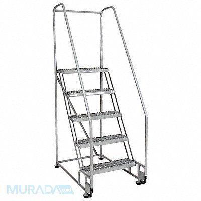 Tilt and Roll Ladder Material Steel Platform Height 40 in Handrails Included Yes Handrail Height 30 in Overall Height 70 in Number of Steps 4 Assembled Load Capacity 450 lb Step Tread Serrated Platform Depth 10 in Platform Width 24 in Bottom Width 28 in Base Depth 37 in Overall Width 28 in Climbing Angle 59 Degrees Step Depth 7 in Step Width 24 in Ladder Actuation None Finish Powder Coated Color Gray Standards ANSI OSHA Includes 2-1/2 in Rubber Pads Rear Exit No