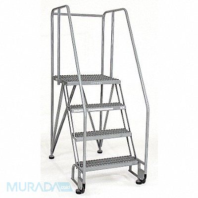 Tilt and Roll Ladder Material Steel Platform Height 40 in Handrails Included Yes Handrail Height 30 in Overall Height 70 in Number of Steps 4 Assembled Load Capacity 350 lb Step Tread Serrated Platform Depth 20 in Platform Width 24 in Bottom Width 28 in Base Depth 47 in Overall Width 28 in Climbing Angle 59 Degrees Step Depth 7 in Step Width 24 in Ladder Actuation None Finish Powder Coated Color Gray Standards ANSI OSHA Includes 2-1/2 in Rubber Pads Rear Exit No