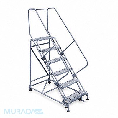 Rolling Ladder Material Steel Platform Height 60 in Handrails Included Yes Handrail Height 30 in Overall Height 90 in Number of Steps 6 Unassembled Load Capacity 800 lb Step Tread Perforated Platform Depth 12 in Platform Width 24 in Bottom Width 30 in Base Depth 60 in Overall Width 30 in Climbing Angle 50 Degrees Step Depth 7 in Step Width 24 in Ladder Actuation Foot Activated Step Lock Finish Powder Coated Color Gray Standards ANSI OSHA Rear Exit No