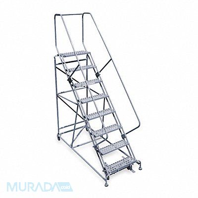 Rolling Ladder Material Steel Platform Height 80 in Handrails Included Yes Handrail Height 30 in Overall Height 110 in Number of Steps 8 Unassembled Load Capacity 800 lb Step Tread Perforated Platform Depth 12 in Platform Width 24 in Bottom Width 32 in Base Depth 78 in Overall Width 32 in Climbing Angle 50 Degrees Step Depth 7 in Step Width 24 in Ladder Actuation Foot Activated Step Lock Finish Powder Coated Color Gray Standards ANSI OSHA Rear Exit No