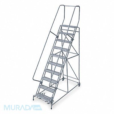 Rolling Ladder Material Steel Platform Height 100 in Handrails Included Yes Handrail Height 30 in Overall Height 130 in Number of Steps 10 Unassembled Load Capacity 450 lb Step Tread Perforated Platform Depth 10 in Platform Width 24 in Bottom Width 32 in Base Depth 72 in Overall Width 32 in Climbing Angle 59 Degrees Step Depth 7 in Step Width 24 in Ladder Actuation Foot Activated Step Lock Finish Powder Coated Color Gray Standards ANSI OSHA Rear Exit No