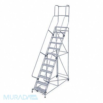 Rolling Ladder Material Steel Platform Height 120 in Handrails Included Yes Handrail Height 42 in Overall Height 162 in Number of Steps 12 Unassembled Load Capacity 450 lb Step Tread Perforated Platform Depth 10 in Platform Width 24 in Bottom Width 32 in Base Depth 88 in Overall Width 32 in Climbing Angle 59 Degrees Step Depth 7 in Step Width 24 in Ladder Actuation Foot Activated Step Lock Finish Powder Coated Color Gray Standards ANSI OSHA Rear Exit No